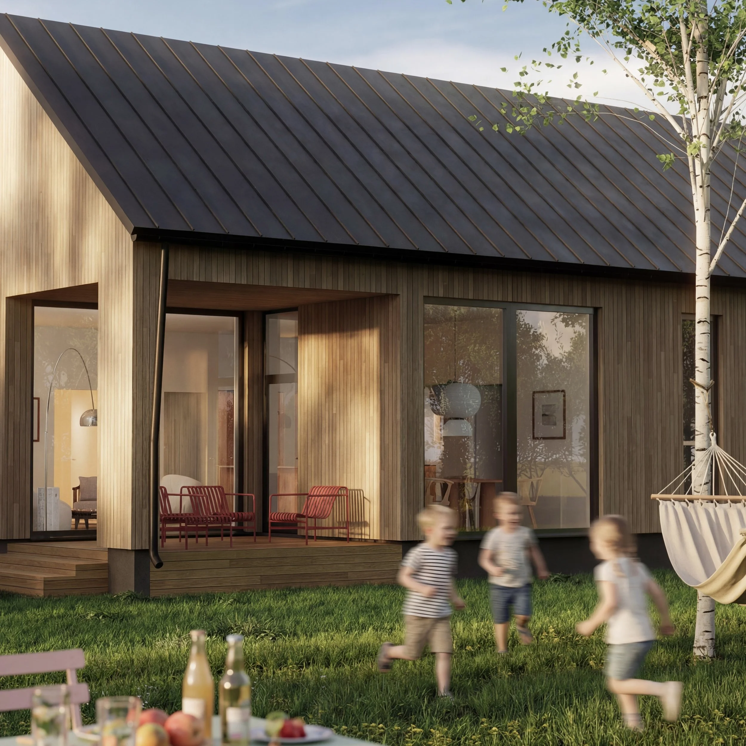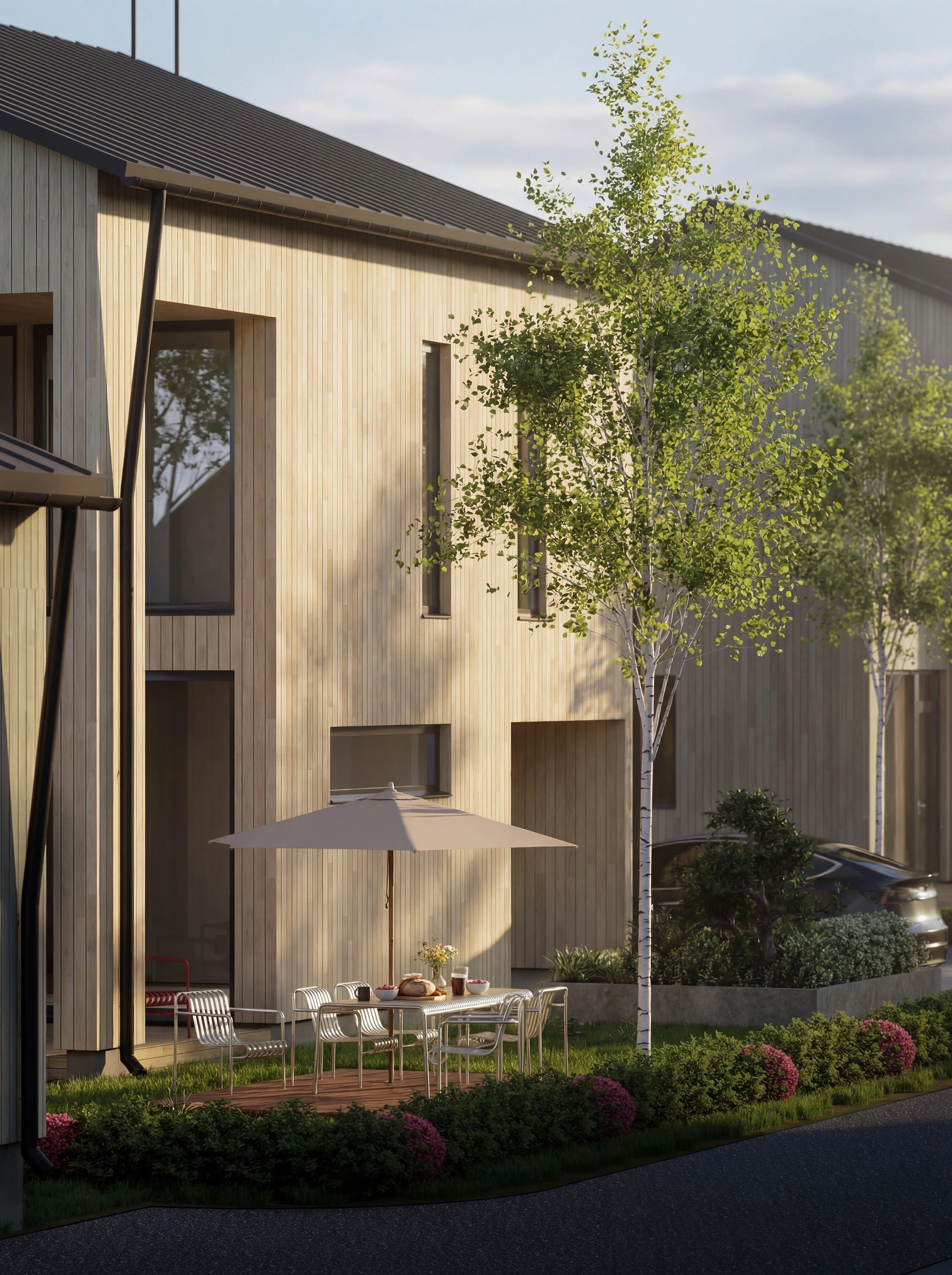 Rakennukset sijoittuvat tontin sisäisen pihatien ympärille niin, että kaikkien asuntojen päätilat avautuvat lounaaseen omalle pensasaidatulle pihalle. Kaikkien talojen lounaisnurkassa on tilava katettu terassi. Auton saa pysäköityä lähelle omaa sisäänkäyntiä ja sisäänkäynnin yhteydessä on myös kätevää katostilaa. Talojen sisäänkäynnit ovat suojaisia ja sisäänvedettyjä. Jokaisessa talossa on tilava ulkovarasto.